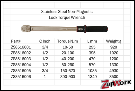 Stainless Steel Anti-Magnetic Lock Torque Socket Wrench 316 & 304 SS Sizes Stainless Steel Anti-Magnetic Lock Torque Adjustable Socket Wrench 316 & 304 SS